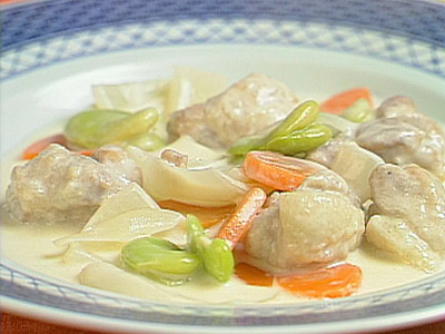 鶏肉にまぶす小麦粉がとろみになっているので、煮ている途中、鍋底をこそげるように混ぜること。