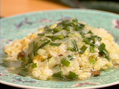 卵に火が通る前にごはんを加えるのがコツ、 卵と油がごはんをコーティングしてパラリと仕上がる。