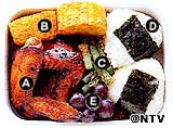 A 手羽先の木の芽焼き B 焼きとうもろこし ゆでたとうもろこしを2cm幅の輪切りにし、手羽先のたれにつけて一緒にオーブンで焼く。 C いんげんのごまじょうゆあえ いんげんをゆでて3cm長さに切り、白ごまとしょうゆであえる。 D 三角おにぎり のりを巻く。 E フルーツ ぶどう