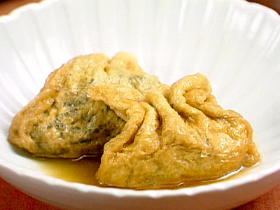油揚げが形よく煮上がるように、形を考えて鍋に並べます。