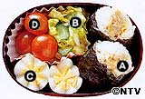 A ゆで豚のねぎみそおにぎり ゆで豚を細かく切ってねぎみそであえ、これを具にしておにぎりにし、のりを巻く。 B キャベツのもみ漬け キャベツは短冊切り、きゅうりは薄切りにして昆布茶少々をふりかけ、手で強くもんで水気を絞る。 C ゆで卵 花形に切り、塩少々をふる。 D プチトマト