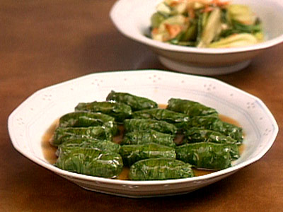 葉は表側を上にして肉だねをのせます。小さめの葉で巻くときは、両端を折りこまないで巻き終わりをきゅっと押さえておくとよい。