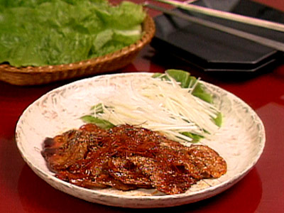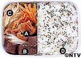 A 豚肉のコチュジャン焼き 白髪ねぎを添える。 B こんにゃくのオランダ煮 切り目を入れて一口大に切ったこんにゃくをごま油で炒め、赤唐辛子、しょうゆ、砂糖各少々で炒りつける。 C にんじんともやしのナムル にんじんはせん切りにし、もやしは洗ってそれぞれゆでる。それぞれおろししょうが、塩、こしょう、ごま油、すり白ごまであえる。 D ごはん 炒り黒ごまをふる。