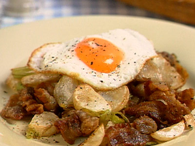 半熟の目玉焼きをくずしてソースのようにからめていただきましょう。