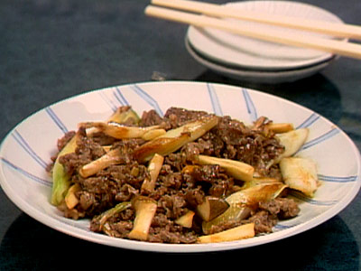 A 牛肉と長ねぎの炒めもの B 春菊と干しえびのあえもの ゆでた春菊は3cm長さに切り、干しえびはもどして刻む。干しえびのもどし汁をしょうゆとごま油で調味し、春菊と干しえびをあえる。 C シューマイ(市販品) D ごはん 味つけザーサイを添え、炒り黒ごまをふる。