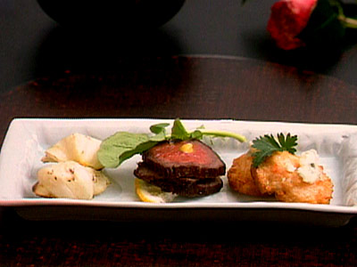 えびのパン揚げ 焼きゆり根 牛肉のたたき