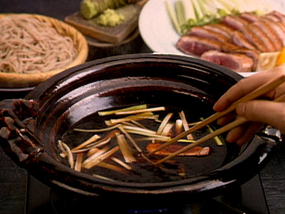 1. そばは固めにゆでます。 2. せりは色よくゆで、茎はそばに混ぜ、残りは4cm長さに切ります。 3. 鴨ねぎ鍋にそばを入れてさっと煮、鴨やねぎとともに椀に盛り、せりをのせます。 4. 好みで長ねぎの小口切りと黒七味唐辛子を添えます。