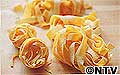 手作りの時間がないときは、乾燥品をゆでて使うとよい。パッパルデッレが手に入らないときは、同じようにひもかわ状のタリアテッレで。右2つはパッパルデッレ、左はタリアテッレの乾燥品。