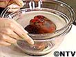 もう一品、赤ピーマンのマリネの赤ピーマンは網で焼いてから皮をむきますが、このとき決して水にはとらないこと。ピーマンのうまみが逃げてしまいます。