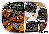 A さわらのつけ焼き さわらは適宜に切り、しょうゆ、酒、みりんのつけ汁につけ、油をひいたフライパンで焼く。 B かぼちゃの甘煮 かぼちゃは一口大に切り、水、酒、砂糖、しょうゆでやわらかく煮含める。 C 根三つ葉のおひたし ゆでた根三つ葉を3cm長さに切り、だし汁で割ったしょうゆに浸して味をつける。 D おにぎり のりを巻く。