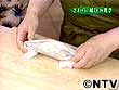 紙の上下をあわせて折り込み、両面も下に折り込む。(ホッチキスで止めなくてよい)