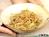 材料: うどの皮(甘酢漬けで残った皮1本分) ごま油 砂糖、しょうゆ 七味唐辛子 作り方: うどの皮は極細いせん切りにし水気をきってから、ごま油で炒め火が通ったら、砂糖、しょうゆを各適量加え、炒りつけます。 器に盛ってお好みで七味をふります。