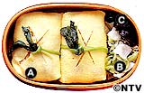 A 茶巾ずし 蒸しずしの具入りのすめしを軽くにぎり、薄焼き卵で茶巾に包み、折り目を下にして上面に切り目を入れ、ゆでた三つ葉で結ぶ。 B かぶとキャベツの浅漬け かぶは薄いいちょう切り、茎は2~3cm長さ、キャベツはざく切りにし、塩をふってもむ。 C おたふく豆(市販品)
