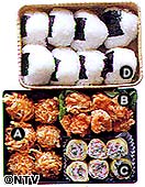 A 揚げ花シューマイ B 鶏のから揚げ ぶつ切りの鶏肉にしょうゆ、酒、塩、しょうが汁、ごま油、溶き卵、片栗粉を混ぜ、カラッと揚げる。 C キャベツ巻きの甘酢漬け ゆでたキャベツで、裂いたかにかまぼこときゅうりのせん切りを棒状に包み、甘酢に漬けて一口大に切る。 D おにぎり 三角おにぎりにのりを巻く。