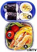 A 甘えびの南蛮酢 B ゆで卵 固ゆで卵を作り、半分に切って黒ごま塩をつける。 C プチトマト サラダ菜にとともに詰める。 D おにぎり 俵形ににぎり、幅広にのりを巻く。