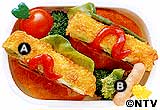 A そら豆とゆで卵のクリームコロッケ ミニロールパンに切り目を入れ、半分に切ったコロッケとサラダ菜をはさみ、ケチャップを添える。 B ブロッコリーの串刺し 小房に分けたブロッコリーを色よく塩ゆでし、1つはソーセージ、もう1つはプチトマトと串に刺す。