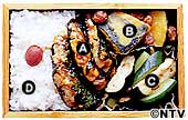 A あじのしそ焼き 青じそに片栗粉をふり、あじのたたきをのせてはさむ。フライパンに油をひいて両面を焼いて火を通し、みりんとしょうゆをふってからめる。 B かぼちゃとレーズンの煮もの かぼちゃは一口大に切り、レーズンとヒタヒタの水を加え、砂糖、塩、酒で調味してやわらかく煮る。 C なすときゅうりの浅漬け なすときゅうりは一口大に切り、塩をふって軽くもむ。 D ごはん 梅干しを添える。
