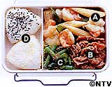 A えびとヤングコーンの炒めもの B 豚肉のしょうが煮 砂糖、しょうゆ、酒、みりんを合わせて煮立て、3cm幅に切った豚薄切り肉とせん切りのしょうがを入れ、炒りつけながら煮る。 C いんげんのおひたし さやいんげんはゆでて半分に切り、だし汁で割ったしょうゆと削りがつおをからめる。 D おにぎり 三角ににぎり、各々白ごまと黒ごまをまぶす。