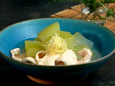 冬瓜は青い色が残るようにピーラーで皮をむき、竹串がやっと刺さるようになるまで下ゆでをします。