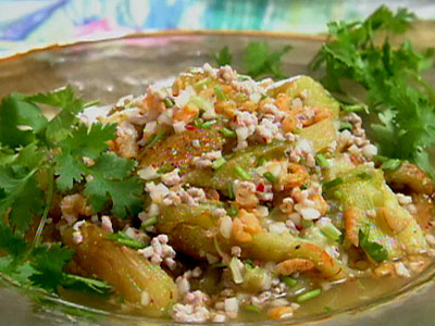 もどした干しえびは火にかけ、煮立ったらひき肉も加え、炒りつけます。この煮汁をきるようにして玉ねぎや香菜と合わせます。