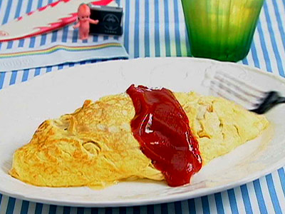 卵の縁が固まってきたら、火からおろしてごはんをのせる。(上面の卵はまだトロトロの状態)