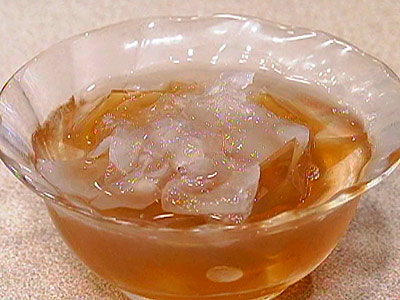 白く半透明の寒天質で、乾燥すると縮んで淡黄色になる。中国料理の高級食材で、不老長寿や滋養薬として珍重され、スープやデザートに使われる。