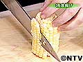 とうもろこしは半分に切ってから実を包丁で削りとります。粒の胚乳(一番根元)ところは揚げたときにハネやすいので除く。