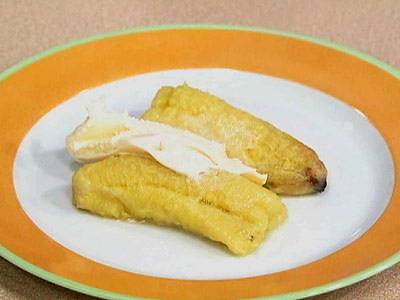 皮が真っ黒になるまでじっくり焼き、バナナの甘みと香りを引き出す。