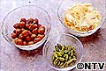 フィリングは複数のナッツを合わせて使いたい。右から時計回りにアーモンドスライス、ピスタチオ、ヘーゼルナッツ。