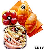 A ビーンズパスタサラダ B ハム(薄切り) C ロールパン パンに切り目を入れておき、ハムとビーンズパスタをはさんで食べる。 D ぶどう