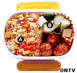 A ミートボールごはん ミートボールソースからミートボールをとり出して詰め、ソースを少し煮つめてごはんに混ぜ、パセリをふって詰める。 B きゅうりとチーズのサラダ きゅうりは板ずりして一口大の乱切り、チーズは角切りにして合わせて詰める。
