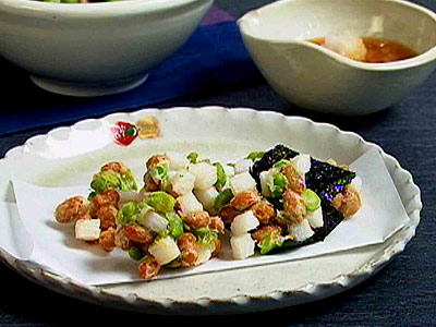 のりをスプーンにのせてたねをのせ、そっと落として揚げる。