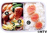 A 豚ヒレ肉のソテー つけ合わせの長芋としし唐辛子のソテーも一緒に詰める。 B 白菜の塩もみ 食べやすく切った白菜に塩をふってもみ、しんなりしたら水気を絞り、にんじんのせん切りを混ぜる。 C ごはん さっと焼いた明太子を輪切りにしてのせる。
