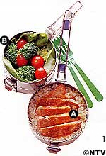 A 豚肉の中国風ステーキ 雑穀ライスの上にステーキをのせ、ソースをかける。 B サラダ サラダ菜を敷き、ゆでたブロッコリーとプチトマトを詰め、好みのドレッシングを添える。