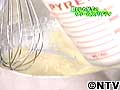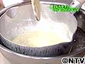 表面がカチカチになる。ここに温めた牛乳を2度にわけて加え手早く泡立て器で混ぜる。(こうすると少しずつとけてダマにならない)