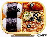 A 炒めなます B 手羽中のたれがらめ みりん、しょうゆ、酒、水少々を合わせて煮立てた中に手羽中の塩焼きを入れ、味をからめる。 C ほうれん草入り炒り卵 溶き卵を塩、砂糖で調味して炒り卵を作り、ゆでて食べやすく切ったほうれん草と混ぜる。 D おにぎり 俵形ににぎったおにぎりにのりを巻く。