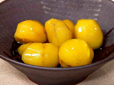 甘煮のポイントは、初めから弱火でゆっくり温度を上げながらゆでること。(煮崩れないように)