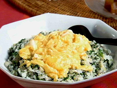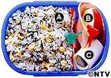 A 春菊ごはんのチャーハン ふわふわ卵を作ったところに、春菊ごはんを入れていため合わせる。 B ハムりんご くし形に切ったりんごを塩水につけて水気をふき、ハムで巻いて楊枝でとめる。 C チーズ巻ききゅうり 一口大の棒状に切ったきゅうりを、スライスチーズで巻いて楊枝でとめる。