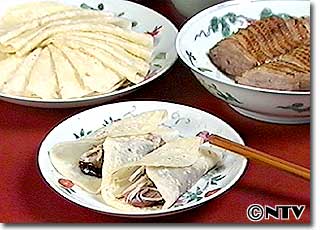 焼き上がった春餅は熱いうちに2枚にはがし、半分に折りたたんで器に盛ります。