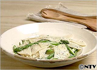 ゆで上がりのパスタをソースとあえるとき、水分が少ないときはゆで汁を足すとよい。