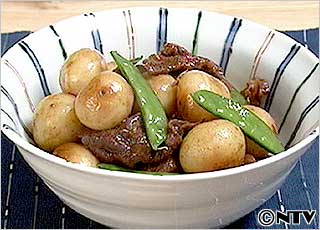 じゃが芋に火が通ったら、牛肉を加え、照りが出るまで7~8分煮、仕上げは絹さやを加えて、鍋をゆすって鍋返しをして汁気をとばします。