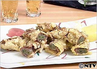揚げるポイント、ふきは火が通っているので牛肉に火が通ればよいので、2~3分衣がうすく色づくくらいでOKです。