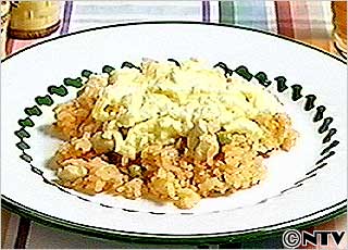 ふわふわ卵のポイントは、火加減は中火、木べらで大きく混ぜながらトロトロのところで火を止め器に盛ります。
