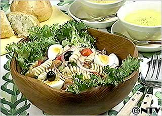 パスタは袋の表示通りにゆで、冷水で洗ってヌメリをとって、ドレッシングの味をからみ易くします。