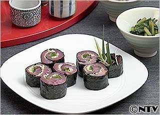 (1)巻きすの上にのりを広げ、青じそを3枚ずつ2段に並べる。