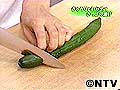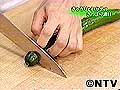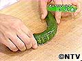 (1)包丁の先がまな板にあたるように斜めに切り目を入れる。