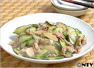 きゅうりは歯ざわりを残す為、長くさっと炒める適度でよいので、豚肉を完全に火を通してから加えます。