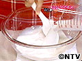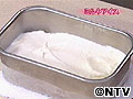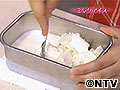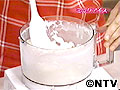 (3)カッターにかけてなめらかな状態にする。ここで、全部溶けてしまっては中に空気が含まない。固いものの粒を細かくして空気を含ませると、ソフトな食感に仕上がる。