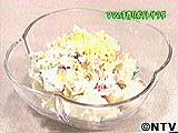 (4)玉ねぎ、きゅうりは薄切りにしてそれぞれ塩をまぶし、少しおいてしんなりしたら、水気をギュッと絞る。 (5)ハムは2cm角に切る。りんごも皮つきのまま2cm角に切る。 (6)ボウルにマヨネーズ、(3)、(4)、(5)を加えてあえ、ゆで卵は1個はざく切りにしていっしょにあえ、残りはみじん切りにして仕上げる。