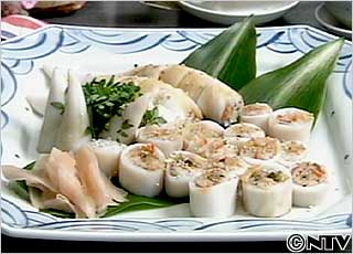 いかは火を通しすぎないことがポイントです。ゆでるときは1本ずつ内側にもさっと煮汁を通してすぐにとり出して、立てかけるようにして汁気をきって冷まします。